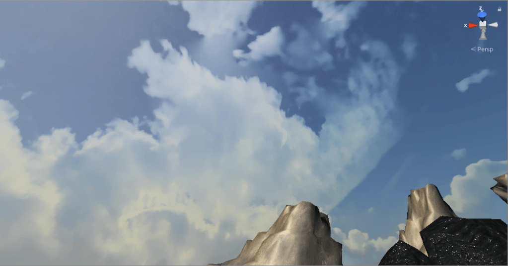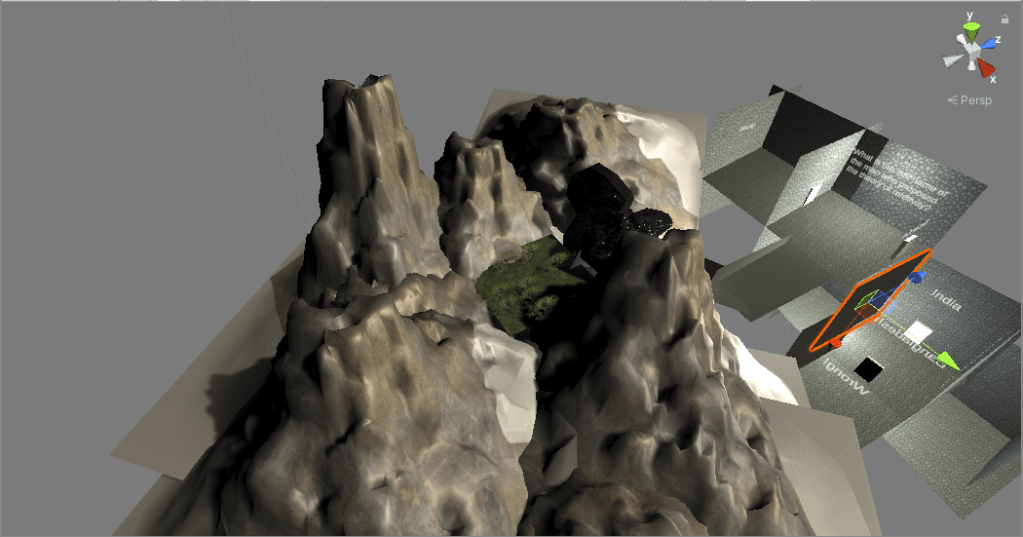 So here’s the starting area. You see some mountains (from the Mountain Terrain asset back), it’s actually only one mountain I copy and pasted multiple times and distorted to block your vision.